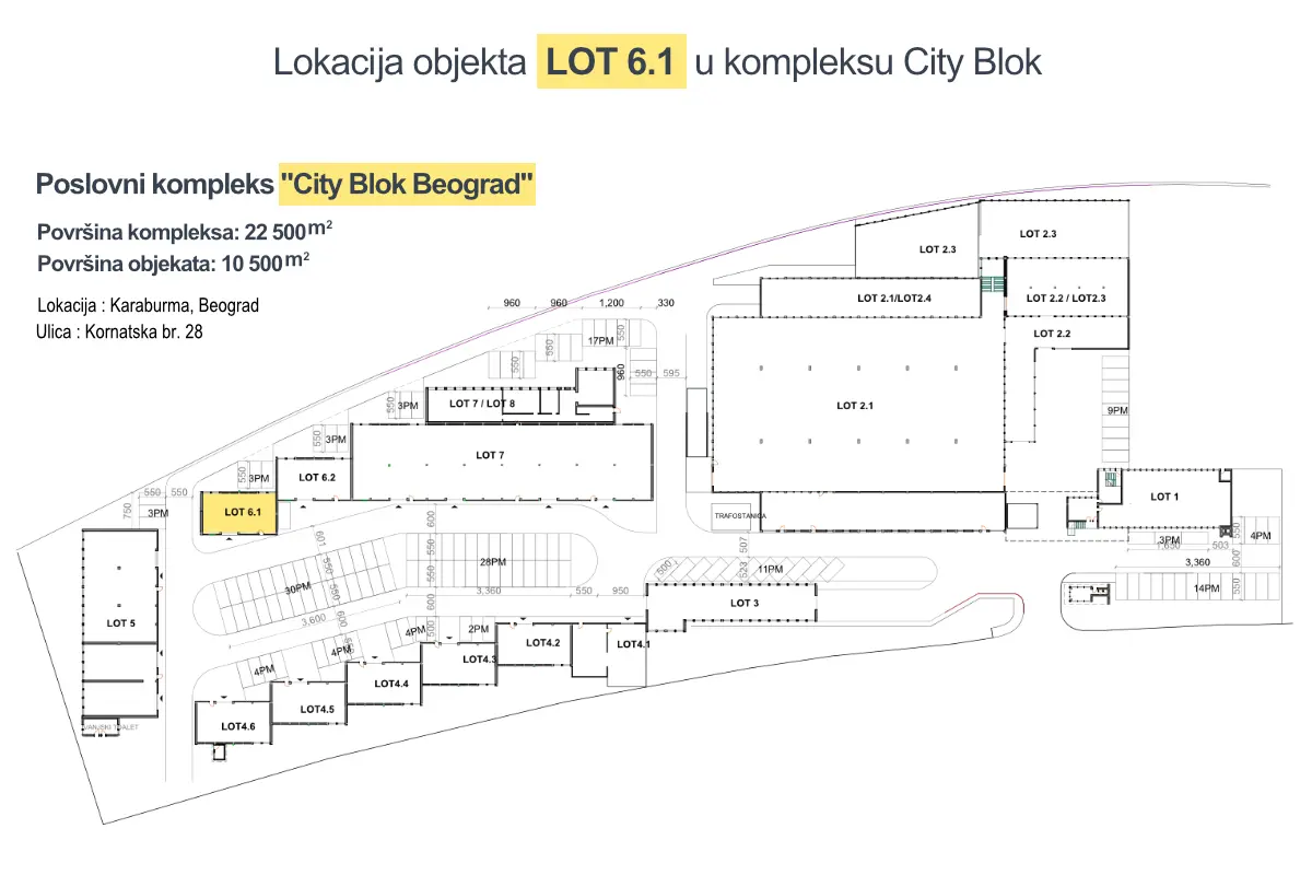 Grundriss der Geschäftsräumen Vermietung von Lagerraum - Lager LOT 6.1, 126m2, Beograd mit entsprechenden Maßen und einer Lageskizze der Lage der Anlage im Gewerbekomplex.